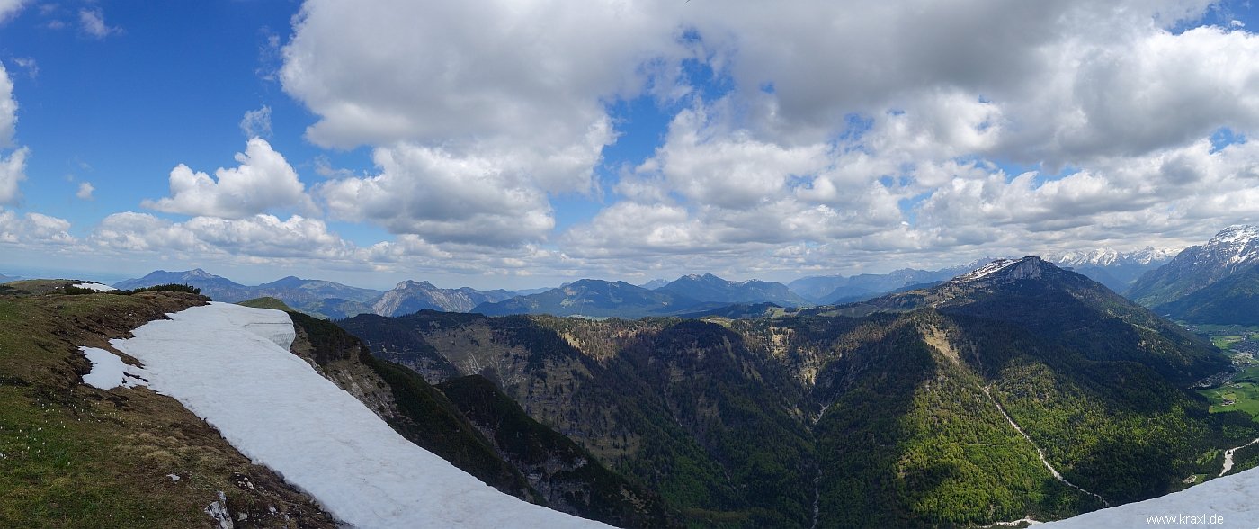 Ausblick vom Fellhorngipfel nach Süden. Links die Lofer Steinberge, rechts das Kaisergebirge.