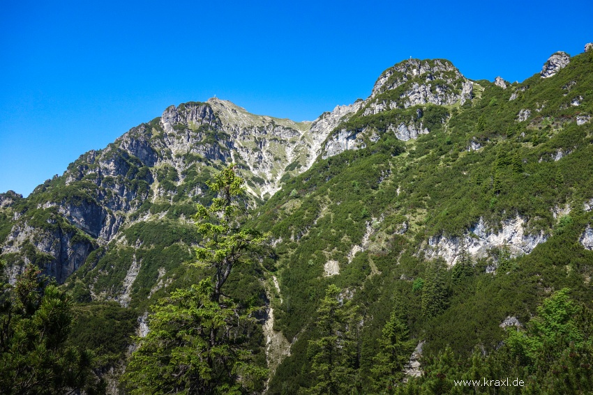 Nördlich der Berggaststätte Sankt Martin folgen wir der Beschilderung über den Kramersteig durch den Wald hinauf. Hier wird der breite aus Garmisch heraufführende Weg immer schmaler und steigt noch moderat an. Unzählige "Abkürzungen" kreuzen im unteren Teil den alten von Königs Maximilian angelegten Reiterweg, der uns schon bald an die Felsenkanzel leitet. Auf dem Weg dorthin bietet der Kramersteig bereits tolle Tiefblicke und auch hier hilft es eine gewissen Schwindelfreiheit zu haben. Die kleine Plattform ragt ein paar Meter über den Abgrund heraus und bietet für einigen Touristen ein tolles Fotomotiv. Auch lässt sich hier prima ein 180° Panorama erstellen. Weiter geht es auf gutem Bergsteig steil empor bis hinauf an den Abzweig zum Königstand. Dort auf ~1475 m zweigt unser Weg nach links ab und leitet uns aufsteilend und deutlich schmaler werdend hinauf an den Grat zwischen Katzenkopf und Mittergern. Die Steilheit und die sommerlichen Temperaturen lassen uns in den Latschen ordentlich schwitzen und so ist es gut, das wir alle ausreichend Gerränke im Rucksack mit hinauf schleppen. Am Grat halten wir uns links nach Westen. Es ist nun deutliche weniger steil, dennoch bleibt es stellenweise anspruchsvoll und so schlängelt sich der Weg weiter durch die Latschen in Richtung Gipfel. Es folgt eine schottrige, felsige mit Drahtseil versicherte Stelle. Im weiteren Verlauf kommen wir am Mittergernkopf mit einer markanten Felsnadel auf deren Spitze ein kleines Kreuz thront vorbei. Diese Besteigung lassen wir heute ausfallen und schauen kurz einem Kraxler zu, wir er sich in der Ferne im kurzen Anstieg müht. Vom grasigen Buckel des Mittergernkopfs geht es zunächst etwa 50 Meter abwärts, bevor wir auf einem schmalen Steig teils kraxelnd die eingebüßten Hm wieder erklimmen. In einem weiten Bogen leitet der Weg um einen namenlosen Vorgipfel das Kramer (ebenfalls mit Kreuz) auf einen Verbindungsgrat und weiter hinüber zum Kramerspitz.