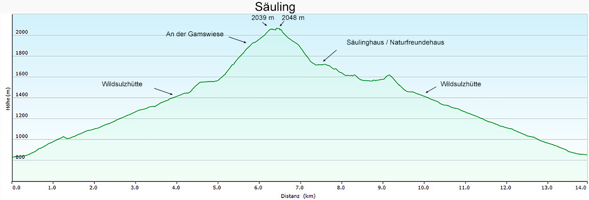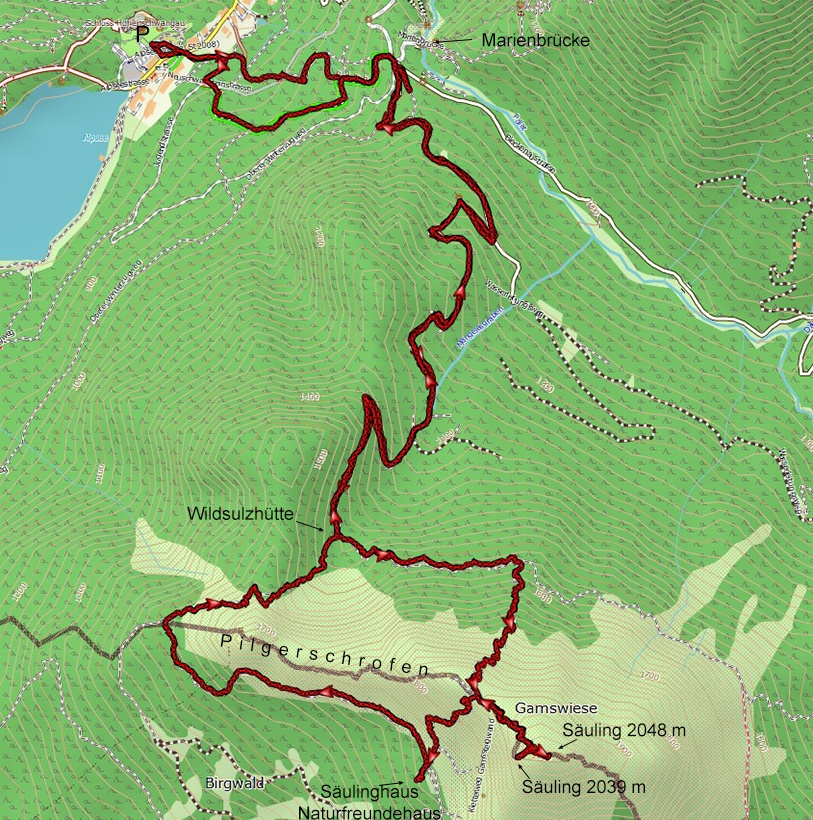Parkplatz - Marienbrücke - Wildsulzhütte - Gamswiese - Säuling Westgipfel - Säuling Ostgipfel - Gamswiese - Säulinghaus (Naturfreundehaus) - Umrundung der Pilgerschroffen - Wildsulzhütte -