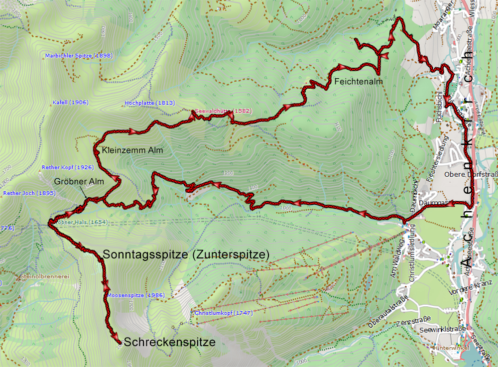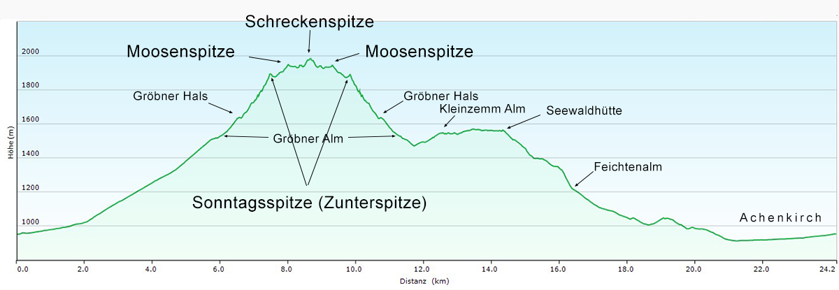 Parkplatz - Unteraubachtal - Gröbneralm - Gröbener Hals - Sonntagsspitze (Zunterspitze) - Moosenspitze - Schreckenspitze - Moosenspitze - Sonntagsspitze (Zunterspitze) - Gröbener Hals - Gröbneralm - Kleinzemm Alm - Seewaldhütte - Feichtenalm - Achenkirch - Parkplatz