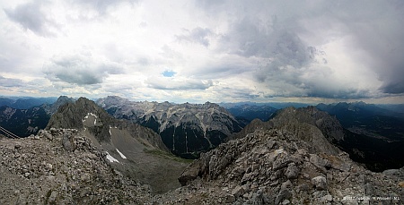 Karwendel, kaum Sicht auf das Wetterstein und Estergebirge. Von da kommen nun doch die Regenwolken zu uns herüber. Also schnell ein paar Bilder geschossen, zügig einen Teil der Brotzeit vertilgt und kaum 20 Minuten später befinden wir uns schon wieder auf dem Abstieg.